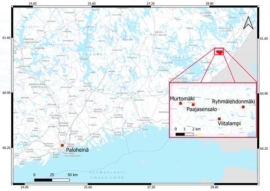 Distribution of the study areas in Helsinki and Ruokolahti. Background map (raster) https://www.maanmittauslaitos.fi/en/opendata-licence-cc40 (accessed on 29 September 2023).