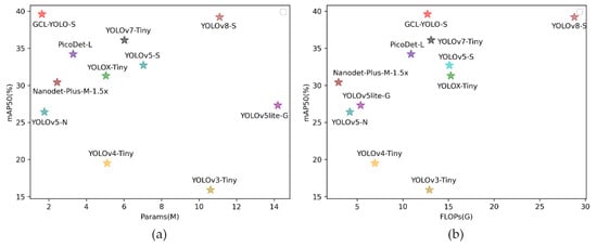 Aiming at solving the above problems, a GhostConv-based lightweight YOLO (GCL-YOLO) network for small object detection in UAV images is proposed in this study. The proposed GCL-YOLO network is derived from the YOLOv5 network, and the structure of each part in the YOLOv5 network is analyzed and redesigned. As in the case of the YOLOv5 network, the proposed GCL-YOLO network introduced a width coefficient and a depth coefficient, and it could also be categorized into four networks (i.e., GCL-YOLO-N, GCL-YOLO-S, GCL-YOLO-M, and GCL-YOLO-L) to meet the requirements of UAV object detection in different applications. The experimental results on the VisDrone-DET2021 dataset show that, compared with other excellent lightweight networks, the proposed GCL-YOLO-S network achieved the highest detection accuracy with the smallest parameter amount and a medium calculation amount, as shown in Figure 2. Additionally, the proposed network achieved the second-highest detection accuracy on the UAVDT dataset.