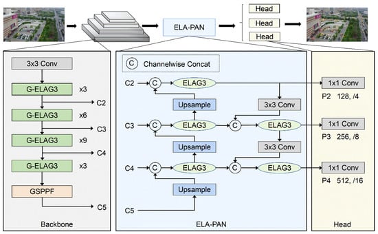 In addition, high-level feature fusion in the PAN module needs a large number of parameters and calculations. As is shown in Table 2, approximately 75% of the parameters were used by the prediction head P5. In other words, high-level feature fusion was mainly used to improve the detection effect of large objects. There are often few large objects in UAV images; thus, it is unnecessary to pay such a high price to improve the detection effect of large objects. In order to balance the detection accuracy and speed, the prediction head P5 for large objects was abandoned. Meanwhile, three convolutions used to adjust the number of channels in the upsampling process were deleted in the ELA-PAN. Therefore, the number of channels at the end of the backbone network can be reduced and the number of network parameters can be significantly reduced.