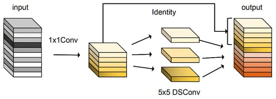 For the compression and pruning of deep learning networks, many studies have showed that the feature maps generated by many mainstream CNNs often contain considerable redundant features, and some of these features are similar to each other. Based on this situation, GhostNet assumes that redundant features in feature maps are the key to the good detection results achieved by some neural networks; then, a GhostConv module was proposed, as shown in Figure 4. Compared with conventional convolution modules, the GhostConv module uses half of the feature channels for 5 × 5 DSConv to expand the receptive field at one time. Then, the other half of the feature channels are spliced to reuse the original features. Benefiting from these cheap operations, more redundant feature maps are generated and better detection results can be achieved by GhostNet.