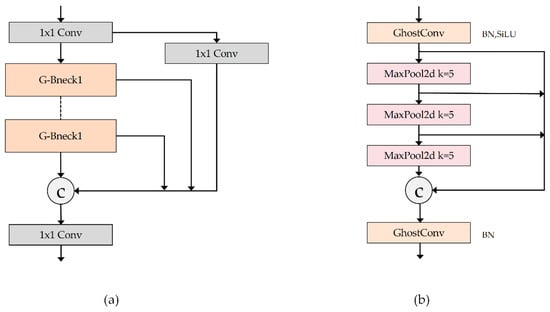 GSPPF. At the end of the backbone network, the SPPF module has vast calculations due to the considerable number of channels. Therefore, two pointwise convolutions were used to reduce the calculation amount and the parameter amount in the YOLOv5 network. In the proposed GCL-YOLO network, a GSPPF module was introduced, as shown in Figure 6b, that is, two GhostConvs were used to replace the two pointwise convolutions to further compress the network. Meanwhile, the activation function in the second GhostConv was not used to maintain the linear relationship of the feature information.