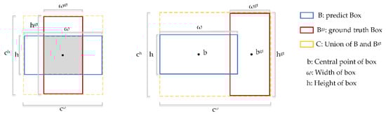 where B and are the predicted box and the ground truth, respectively; and are the width and height of the ground truth, respectively; and and are the width and height of the predicted box, respectively.