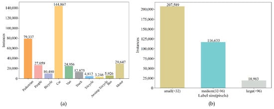(a) The label number of each object category and (b) the number of object labels of different sizes in the VisDrone-DET2021 dataset.