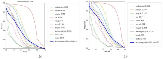 In order to further demonstrate the feasibility and effectiveness of the proposed network, Figure 15 shows the precision–recall (P–R) curves obtained by the YOLOv5-S network and the GCL-YOLO-S network. In addition to the P–R curves of each object category in the VisDrone-DET2021 dataset, the corresponding mAP50 of each category is shown in the legend. It can be seen from Figure 15 that the detection accuracies of all object categories achieved by the proposed GCL-YOLO-S network were better than those achieved by the YOLOv5-S network. Especially for the four categories of pedestrian, van, bus, and motor, the mAP50 was improved by 9%–10%. Generally, pedestrian and motor in the test dataset had fewer image pixels. Such an accuracy improvement was mainly due to the fusion of object location information in the low-level feature maps and the processing of prediction boxes by the Focal-EIOU loss.