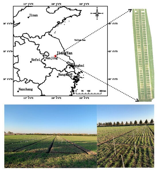 This experiment was conducted during the winter wheat growing season 2022–2023 at the Jiangsu Modern Agricultural Technology Comprehensive Demonstration Base in Jiangyan District, Jiangsu Province, China (Figure 1). The experimental field consisted of 72 plots, with the initial 48 plots designated for Experiment 1 and the subsequent 24 plots allocated to Experiment 2. Both Experiment 1 and Experiment 2 focused on investigating nitrogen fertilizer management in wheat cultivation; however, they differed in research subjects and design approaches.