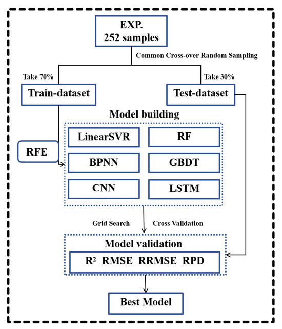 Machine learning algorithms have significant potential in estimating winter wheat SPAD values [65]. This study employed six machine learning algorithms: LinearSVR (Linear Support Vector Regression), RF, BPNN, GBDT, CNN, and LSTM (Long Short-Term Memory). These algorithms were used to establish prediction models for winter wheat SPAD values. Figure 2 illustrates the workflow of model development.