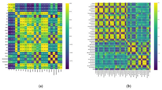 Heatmaps of Correlation Analysis between: (a) VIs with SPAD Values; (b) TIs with SPAD Values.