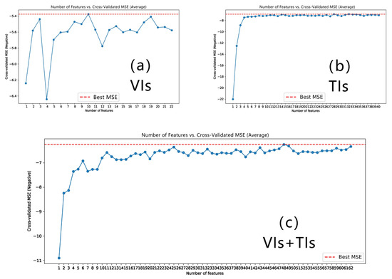 Learning Curve of RFE Feature Selection: (a) VIs; (b) TIs; (c) VIs + TIs. Note: MSE (Mean Squared Error) is a metric used to evaluate regression. In scikit-learn, all scoring metrics are transformed to a larger-is-better format. For MSE, smaller values are better. To align with the larger-is-better convention, the negative of MSE is taken.