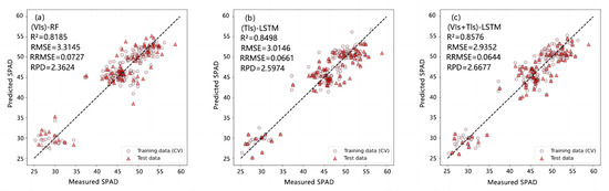 Scatter plots depicting the relationship between measured SPAD values and predicted SPAD values for the optimal estimation models constructed using different remote sensing variables: (a) RF (VIs); (b) LSTM (TIs); (c) LSTM (VIs + TIs). The diagonal line represents the 1:1 relationship.