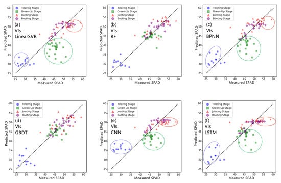 As apparent from the scatter plot depicted in Figure 8, a significant number of data points are concentrated closely around the diagonal line representing a 1:1 ratio. This clustering signifies a high degree of concordance between the values that were measured and those that were predicted. Thus, the LSTM-based estimation model designed for winter wheat canopy SPAD values prior to heading demonstrates a strong alignment across diverse winter wheat cultivars and various strategies for nitrogen fertilizer management.