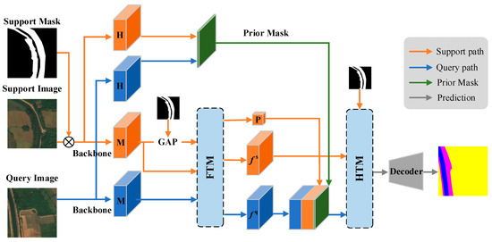 The architecture of the FTNet. This network was built in a meta-learning manner with a prior mask [18]. The FTM and HTM are designed for better performance. H is the high-level feature, M is the middle-level feature, P is the prototype, is the support feature, is the query feature, ⊗ is the element-wise multiplication, and GAP denotes the global average pooling.