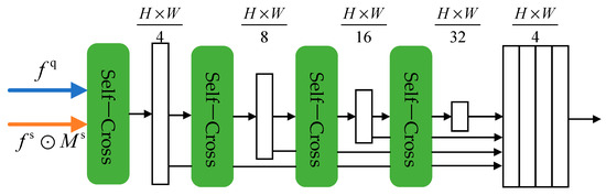 where , , and are the learnable parameters, and is the hidden dimension. Equation (11) is a general form of cross-attention. As shown in Figure 2, when the features in and are replaced with , Equation (11) represents the self-attention manner, which represents the relationship among query features. The main task of the HTM is to calculate an informative query feature. Thus, we only performed self-attention within the query path in a standard multi-head manner [12]. In addition, a cross-attention layer follows self-attention. Similar to [27], was obtained from the query features, and and were obtained from the support features. Inspired by the ResNet [10] and SegFormer [14], we design a hierarchical architecture with four scale blocks. Each block contains self- and cross-attention, followed by downsampling. At the end of the HTM process, we concatenated the four blocks after scaling them to the same resolution. In a nutshell, our model extracts abundant information within query features and obtains pixel-wise matching correlations using a cross-attention layer. We demonstrate the role of the HTM in mining this matching relationship, as detailed in Appendix B.