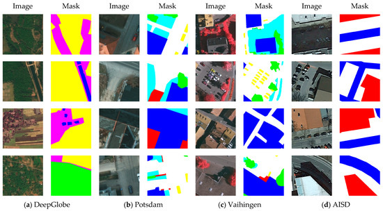 Some images and their corresponding masks of our benchmark: (a) data from DeepGlobe; (b) data from Potsdam; (c) data from Vaihingen; and (d) data from AISD.