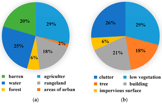 Potsdam [34] was captured over Potsdam in Germany by aerial cameras. This dataset is annotated into six categories: clutter, tree, low vegetation, building, car, and impervious surface. The ground sampling distance of the images was 5 cm. We removed the category “car” because of the overlap with the source domain used in our work. The buildings in Potsdam are scattered and the category distribution is more balanced. Potsdam contains 38 image patches. The size of all images is 6000 × 6000. Each image was divided into 225 equal pieces. Similar to the DeepGlobe dataset, we removed pairs with a single category. Finally, we obtained 1896 pairs containing five categories. We named this dataset FSS-RSI-Potsdam; some samples are shown in Figure 3b.
