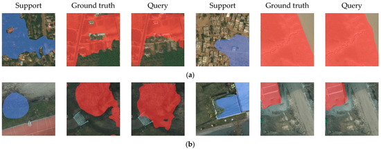 DeepGlobe [33] consists of natural landscape images taken by satellites. This dataset is annotated into seven categories: unknown, urban, aquatic, agricultural, forested, barren, and rangeland areas. The ground sampling distance was 50 cm. However, only 803 training images were labeled with a size of 2448 × 2448. Fortunately, this dataset was adopted as a tool for FSS-RSI, so DeepGlobe’s training set could meet the need. Specifically, we divided each image into 36 equal blocks and resized them to 400 × 400. The category “unknown” was set as the background. Images that contained only a single category were filtered out. Finally, we obtained 9175 pairs containing six categories. We named this dataset FSS-RSI-DeepGlobe; some samples are shown in Figure 3a.