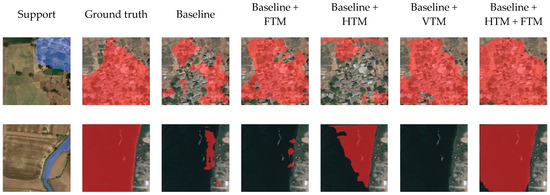 As can be seen, the PFENet achieved an mIoU that was 10% lower on the FSS-RSI-DeepGlobe and FSS-RSI-Potsdam datasets, especially for the value of only 2.42% in the FSS-RSI-DeepGlobe’s five-shot setting. This proves that the PFENet had no FSS-RSI performance on these two datasets. However, as illustrated in Appendix C, the PFENet’s performance within the domain was good. The same is true for RPMMs on the FSS-RSI-Potsdam dataset. As already known, the HDMNet is a cutting-edge FSS model, even with only its meta branch. The results can be seen in Appendix C. However, for the FSS-RSI task, the HDMNet did not perform well. The obtained mIoUs were 17.70 and 23.08 in the one-shot and five-shot settings, which were 41.16% and 17.56% lower than the FTNet, respectively. Performing slightly worse than our method, the HSNet performed suboptimally on FSS-RSI-DeepGlobe’s one-shot and five-shot settings and on FSS-RSI-Potsdam’s one-shot setting. We found that except for the PFENet, the five-shot results of all models were better than the one-shot results. This phenomenon indicates that when there are more support data, FSS-RSI performs better, which is similar to FSS. This experiment showed that the FTNet achieved the best result in FSS-RSI with absolute advantages over the other cutting-edge FSS methods.