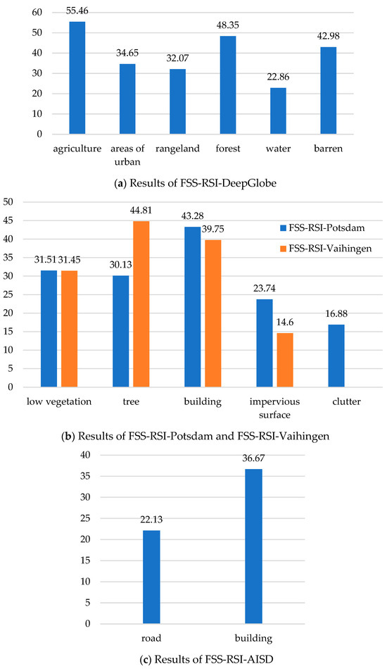 The mIoUs (%) of different categories: (a) FSS-RSI-DeepGlobe; (b) FSS-RSI-Potsdam and FSS-RSI-Vaihingen; and (c) FSS-RSI-AISD.
