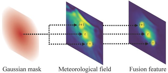 where m is the two-dimensional feature calculated by a Gaussian function, which is called the Gaussian mask. (x, and y) represents the positions on the mask. depends on experience selection. We choose the Gaussian function for three reasons: (i) The mean value of the Gaussian distribution is (lat, long); that is, the mask retains the location information. (ii) The Gaussian mask shares a similar distribution to values in the field. For example, the pressure field is the lowest at (lat, long), and the value gradually increases as it is farther away. (iii) The Gaussian map is a common distribution in the fields of mathematics and physics. In addition, it is simple to implement. In addition, although the Earth is an elliptical sphere, it can be roughly deemed as a plane in the local area. Thus, we use the same in the equation for simplification.