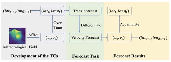 In general, there are two issues with current approaches. (i) Feature misalignment: Accurate track forecasting of tropical cyclones (TCs) requires a consideration of both location and field data, which are, respectively, one-dimensional and two-dimensional in nature. Prior research such as [,] implemented convolutional neural networks (CNNs) to reduce the fields to one-dimensional features before fusing with location. However, a reduction in dimensionality leads to a loss of spatial alignment between the fields and the track, despite their high correlation. (ii) Velocity integration: The fundamental concept driving TC track prediction is the accumulation of velocity over time. Although [] formulates track forecasting by deriving the difference vector between current and future positions, this approach does not explicitly model velocity forecasting.