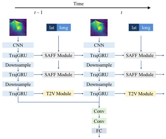 We first constructed a model that could handle the input data and , which produced the forecast result o for the velocity. To accomplish this, we utilized the SAFF module for feature fusion and the T2V module for task conversion. Specifically, we incorporated TrajGRU [] as the backbone for its ability to extract spatio-temporal features from , including the calculation of optical flow, which represents the trajectory of TCs in the fields and is instrumental in track forecasting. The hidden state of TrajGRU is fused with the input in the SAFF module, and, at a deeper layer, the expressive state and are used to calculate the velocity forecast via the difference calculation. The structure of the forecast model is depicted in Figure 4 and is referred to as TC-TrajGRU.