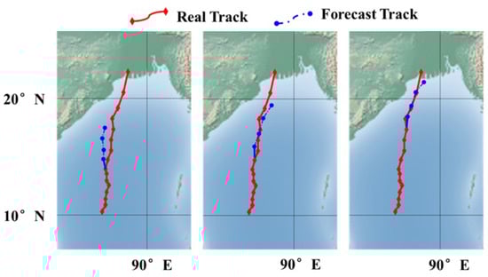 Meteorological fields, such as wind and pressure fields, play a significant role in the development of tropical cyclone (TC) tracks []. Convolutional neural networks (CNNs) are commonly adopted to extract valuable information from these fields []. However, most existing methods focus on tracking TCs rather than forecasting their future movements. Nevertheless, some forecasting methods utilize meteorological fields as input to predict TCs’ trajectories []. Mudigonda et al. [] proposed a hybrid CNN-LSTM model for TC tracking, which confirmed the correlation between meteorological fields and TC tracks. Kim et al. [] regarded TCs as target objects in the meteorological fields and developed a spatial–temporal model based on ConvLSTM [] to forecast TC tracks from wind velocity and precipitation fields. However, this method generates detection frames rather than precise latitude and longitude information.