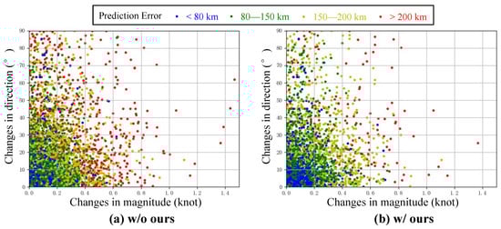 In Figure 6, we visualize the effects of our methods on prediction errors, alongside changes in directions and magnitudes. We split the prediction errors into four ranges: <80 km, 80–150 km, 150–200 km, and >200 km. As shown in the figure, as the changes in direction or magnitudes increase, the prediction difficulty grows. With our methods, there are more predictions with controllable small errors (<80 km) and less predictions with very large errors (>200 km). This detailed visualization shows the effectiveness of our method.