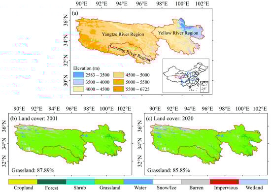The TRHR is located in the southern part of Qinghai Province, China, the hinterlands of the Tibetan Plateau. It has an average elevation surpassing 4000 m (Figure 1a). The topography of the TRHR gradually descends from the southwest to the northeast, marked by elevations exceeding 5000 m in the southwest, 4000–5000 m in the central region, and 3000–4000 m in the northeast. TRHR is the origin of the Yangtze, Yellow, and Lancang rivers, encompassing an area of approximately 3.6 × 105 km2. The TRHR is one of the most concentrated areas of high-altitude biodiversity in the world. This region features dense river networks, rich lakes, extensive snowy mountains, and an interwoven landscape of glaciers []. These features earned the TRHR the moniker of the “Chinese Water Tower”. The climate in the TRHR is typical of plateau continental climates []. Its annual mean maximum temperature, minimum temperature, and precipitation are 4.9 °C, −8.8 °C, and 498.9 mm, respectively (Supplementary Materials, Figure S1). The months from May through September constitute the GS in the TRHR []. During the GS, the average temperatures (calculated as the mean of the maximum and minimum temperatures) consistently exceed 0 °C, and GS precipitation accounts for 85% of the annual total. The spatial distribution of the annual mean precipitation declines from over 600 mm in the southeast to under 300 mm in the northwestern corners (Supplementary Materials, Figure S2a). This pattern echoes in the GS precipitation distribution, albeit with slightly lesser magnitudes (Supplementary Materials, Figure S2b). The annual mean temperatures are >0 °C in the eastern and southern parts of the TRHR (Supplementary Materials, Figure S2c), further escalating during the GS in these locales (Supplementary Materials, Figure S2d). According to the land cover data with a 30 m spatial resolution [], grasslands accounted for 87.89% (Figure 1b) and 85.85% (Figure 1c) of the TRHR’s total area in 2001 and 2020, respectively. This illustrates a subtle decline in grassland coverage over the past two decades, though it is still the predominant land cover type in the region.