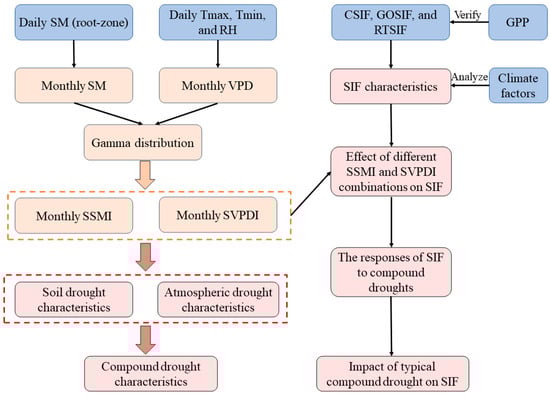 As illustrated in Figure 2, we first calculated the monthly SM and VPD based on the daily SM, Tmax, Tmin, and RH, then calculated SSMI and SVPDI using the gamma distribution function. Next, we obtained the spatial and temporal patterns of the photosynthetic capacity of vegetation based on the three sets of SIF data, then analyzed changes in the SIF under the conditions of different combinations of the SSMI and SVPDI. Finally, we investigated the effects of atmospheric droughts, soil droughts, and compound droughts on the SIF and analyzed the response characteristics of the SIF through a typical compound drought event.