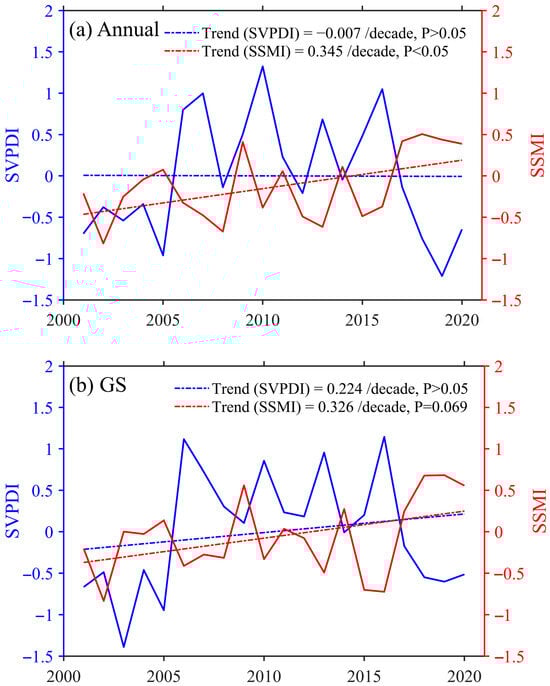 (a) Annual and (b) GS changes in SVPDI and SSMI in the TRHR during 2001–2020. The blue and red solid lines indicate the changes in SVPDI and SSMI, respectively.