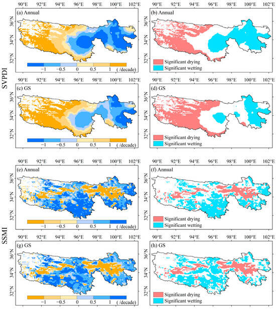 Spatial distribution of (a,b) annual and (c,d) GS SVPDI trends in the TRHR during 2001–2020. Spatial distribution of (e,f) annual and (g,h) GS SSMI trends in the TRHR during 2001–2020. The statistical significance was identified at p < 0.05.