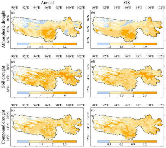 The spatial durations of the annual (Figure 5a) and GS (Figure 5b) atmospheric droughts were generally similar, with longer durations in the southern parts of the TRHR. Soil droughts with relatively long duration occurred mainly in the eastern parts of the TRHR, at up to 5 months/year (Figure 5c) and 2 months/year (Figure 5d) on the annual and GS timescales, respectively. Annual compound droughts generally lasted from 1 to 2.5 months/year (Figure 5e), while GS compound droughts generally lasted from 0.3 to 1.2 months/year (Figure 5f). Areas with lengthy annual compound droughts reaching 2 months/year were distributed throughout the western and southern parts of the TRHR. The spatial durations of GS compound droughts were broadly similar to those of annual compound droughts, but generally longer in southern and eastern parts.