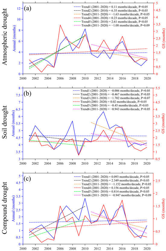 Annual and GS duration (months/year) of (a) atmospheric, (b) soil, (c) compound droughts during 2001–2020. Solid blue and red lines indicate drought changes on the annual and GS timescales, respectively.