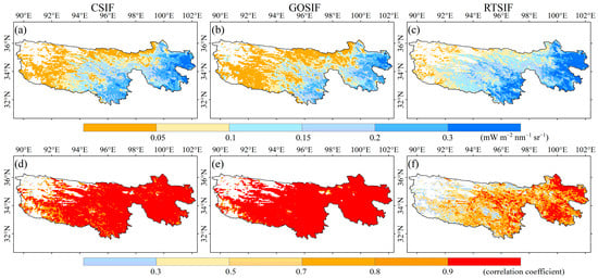Spatial distribution of mean (a) CSIF, (b) GOSIF, and (c) RTSIF during GS from 2001 to 2020. Relationships between GPP and (d) CSIF, (e) GOSIF, and (f) RTSIF at annual GS timescale.