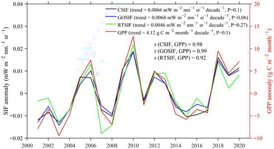 The annual GS-averaged SIF showed increasing trends during 2001–2020 (Figure 8), which was especially the case for GOSIF (0.0068 mWm−2nm−1sr−1decade−1). This suggests that vegetation greening significantly increased in the TRHR during those years. The annual variations in GPP and SIF were more consistent, with a trend value of 4.12 gCm−2month−1·decade−1. The correlation coefficients of GPP and the three types of SIFs exceed 0.9 on the annual timescale, indicating that SIF responds well to GPP characteristics in the TRHR.