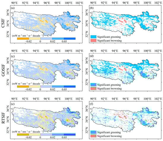 Spatial GS trends of (a,b) CSIF, (c,d) GOSIF, and (e,f) RTSIF in the TRHR during 2001–2020. Trend significance identified at p < 0.05.