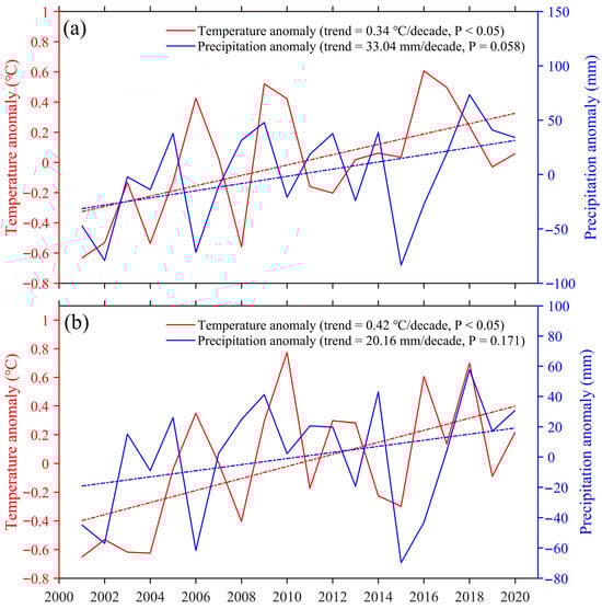 Anomalies of air mean temperature and precipitation, (a) annual and (b) GS, across TRHR grasslands during 2001–2020. Red dotted lines and blue dotted lines indicate temperature and precipitation trends, respectively.