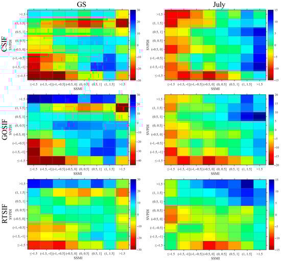 The SVPDI and SSMI were found to be negatively correlated, especially in the 1-month SVPDI and 1-month SSMI for July and August (Supplementary Materials, Figure S3). This suggests a strong coupling between the SVPDI and SSMI in warmer seasons and a higher probability of simultaneous occurrence. We extracted valid grids with time period means greater than 0.01 mWm−2nm−1sr−1 for SIF to calculate the SIF anomaly percentages corresponding to different drought thresholds. We divided the monthly SVPDI and SSMI into 8×8 bins at 0.5 index value intervals, then assessed the SIF anomalies at different thresholds of compound droughts. As shown in Figure 11, low SSMI and low SVPDI combination events during the GS correspond to low SIF values. This may be due to the low SVPDI caused by low temperatures, thus limiting the growth of vegetation in the TRHR during the GS [,]. High SVPDIs corresponding to high temperatures in the GS favor the growth of vegetation (i.e., promote photosynthesis) and thus correspond to positive SIF anomalies. The hottest month (July) was analyzed instead of the GS to find that a further increase in the SVPDI under relatively dry conditions corresponded to a decrease in SIF due to the closure of vegetative stomata, which prevents vegetative photosynthesis [,]. Therefore, low SSMI and high SVPDI values corresponded to negative anomalies of SIF in July in the TRHR.