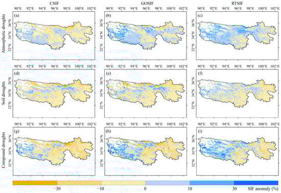 July SIF anomalies under atmospheric and soil droughts in the TRHR during 2001 to 2020. (a) CSIF, (b) GOSIF, and (c) RTSIF in response to atmospheric droughts. (d) CSIF, (e) GOSIF, and (f) RTSIF in response to soil droughts. (g) CSIF, (h) GOSIF, and (i) RTSIF in response to compound droughts.