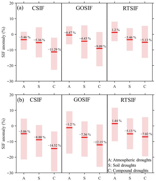 Anomalies of July SIF triggered by atmospheric and soil droughts in the Yellow River source region during 2001 to 2020. (a) Threshold criterion for atmospheric drought is SVPDI ≥ 0.5; for soil drought, it is SSMI ≤ −0.5; and for compound drought, it satisfies both SVPDI ≥ 0.5 and SSMI ≤ −0.5. (b) Threshold criterion for atmospheric drought is SVPDI ≥ 1; for soil drought, it is SSMI ≤ −1; and for compound drought, it satisfies both SVPDI ≥ 1 and SSMI ≤ −1. Light-red box indicates the 10th–90th range, and red line marks the mean SIF anomaly.
