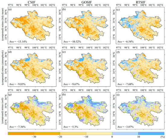 (a–c) SIF anomalies of the Yellow River source region in July 2017 caused by compound drought (SVPDI ≥ 0.5 and SSMI ≤ −0.5). (d–f) Additional effects of compound drought compared to atmospheric drought (SVPDI ≥ 0.5) causing a decrease in SIF. (g–i) Additional effects of compound drought compared to soil drought (SSMI ≤ −0.5) causing decrease in SIF. The additional effect of compound drought was calculated as the difference in SIF anomalies between the July 2017 compound drought and the multi-year average (2001–2020) July atmospheric drought (or soil drought) alone.