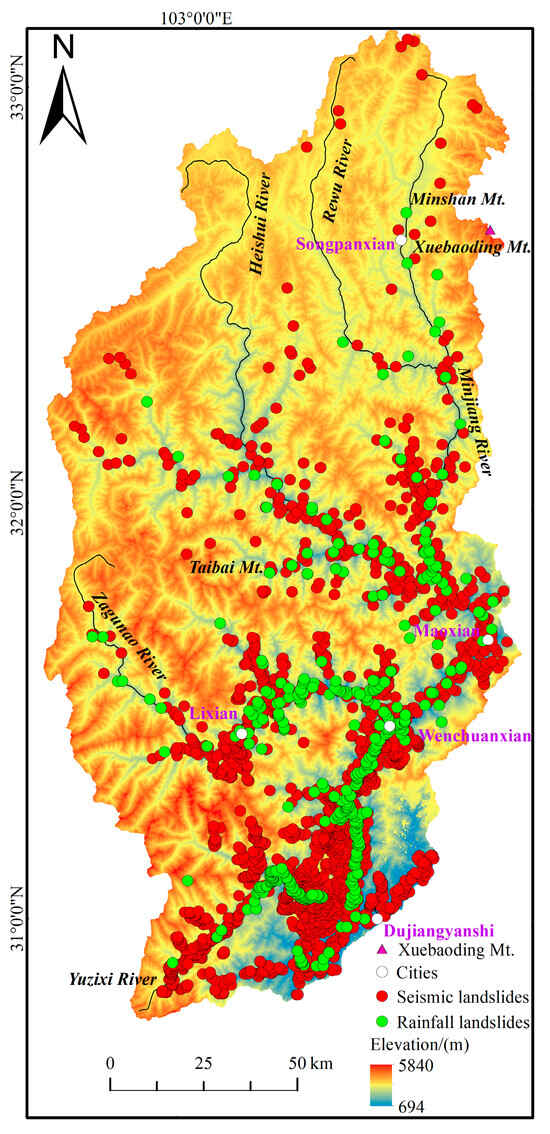 The upper Minjiang River Basin is located in the eastern margin of the Tibetan Plateau, covering an area of about 22,000 km2 [41], and its elevation changes are between 694 and 5840 m. The geological structure is complex, mainly composed of NE- and NW-oriented faults, with frequent seismic activity [42]. The stratigraphic lithology is dominated by sandstones and siltstones interspersed with micaceous rocks; shales, micaceous, and siltstones; limestones and sandstones; and granitic rocks. It is also influenced by the southwest monsoon, with rainfall concentrated in summer, and it experiences serious effects of geological hazards such as landslides. The region is similar to other regions located on the Tibetan Plateau, with the same active environmental conditions and more intense climate change [43]. The upper reaches of the Minjiang River Basin studied in this research mainly include Songpan, Maoxian, Lixian, Wenchuanxian, and Dujiangyan where several major cities are located, and 3343 landslide sites were collected here, including 407 rainfall landslides and 2936 seismic landslides. The catalogued data of landslides used in this research and the overview of the study area are shown in Figure 1.