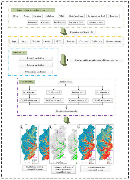 At present, there has been relatively little research on the classification of rainfall and seismic landslides in the upper reaches of the Minjiang River Basin conducted by predecessors. Therefore, the susceptibility mapping of the two types of landslides is lacking, making it difficult to provide sufficient support for the prevention and control of landslide geological disasters. This research intends to take the upper reaches of the Minjiang River Basin as an example to obtain evaluation maps of rainfall, seismic, and unclassified landslide susceptibility, respectively. The development patterns of different types of landslides based on background factors will be explored at the same time. Meanwhile, this research proposes to refer to the spatial superposition of multiple hazards [40], obtaining spatial comparisons of landslide susceptibility maps obtained from unclassified landslides and the final landslide susceptibility map obtained by overlaying rainfall and seismic landslide susceptibility maps, and it also attempts to explain the variability in spatial distribution in terms of cartographic principles. In addition, this research combines the weight of evidence with the random forest algorithm. The reason for coupling the weight of evidence with the random forest model is that this research mainly investigates the effect of different landslide catalogs on the prediction results of compound landslide susceptibility (i.e., spatial superposition of rainfall and seismic landslide susceptibility maps to obtain the compound landslide susceptibility map, and susceptibility map obtained by using unclassified landslides), and attempts to explain the two results in terms of the mapping principle in order to help elucidate the need to use different landslide catalogs for different problems. The contribution of different cataloged landslides to each background factor is different since the two methods use different landslide catalogs, which makes the spatial relationship between landslides and background factors not the same, so it is necessary to firstly get the spatial relationship to derive the contribution of each background factor to the landslide prediction, as opposed to directly inputting the values of the background factors into the model for prediction. The coupling of the two models can make the prediction results more realistic.