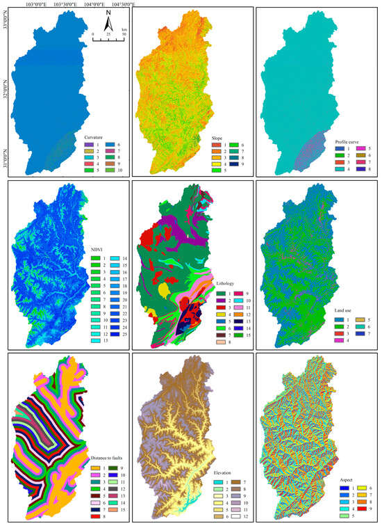 Considering the area of the upper reaches of the Minjiang River Basin, the distribution of landslides, and the accuracy of the original topography, this research chose to establish a 200 × 200 m grid for analysis, and initially selected lithology, NDVI, elevation, slope, aspect, relief amplitude, surface cutting depth, profile curve, plan curve, curvature, land use, distance to faults, and distance to rivers for analysis, which are the 13 most relevant background factors to the landslides in the upper reaches of Minjiang River Basin. Among them, two linear elements of faults as well as rivers were buffered at 200 m intervals throughout the whole study area, and correlation analysis was performed for the 13 selected factors, then correlation coefficients that were less than 0.3 were considered uncorrelated between the factors [52]; finally, there were nine background factors involved in the model building through correlation analysis. The nine landslide susceptibility modeling background factors included the following: lithology, NDVI, elevation, slope, aspect, profile curve, curvature, land use, and distance to faults. Among them, the two discrete variables of lithology and land use by category were renumbered; the aspects were divided into nine categories according to the values, where -1 was divided into plane, (0, 22.5) and (337.5, 360) for north, (22.5, 67.5) for northeast, (67.5, 112.5) for east, (112.5, 157.5) for southeast, (157.5, 202.5) for south, (202.5, 247.5) for southwest, (247.5, 292.5) for west, and (292.5, 337.5) for northwest; the remaining continuous type factors were divided into equal intervals according to the distribution of the data. The specific factor grades are shown in Figure 3.