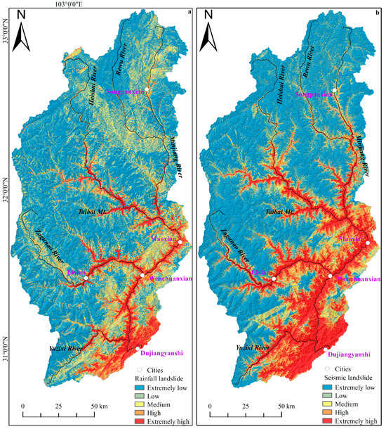 Figure 5a,b show extremely high susceptibility areas of rainfall and seismic landslides. Through comparison, it can be found that the similarities between the two are that both extremely high areas of rainfall and seismic landslides are distributed along the main parts and tributaries of rivers; both rainfall and seismic landslides are prone in Maoxian, Lixian, Wenchuanxian, and Dujiangyan, whereas Songpanxian is less prone to landslides compared with the other four counties and cities, especially rainfall landslides; along the line from Xueboding mountain to Lixian, there are relatively few rainfall and seismic landslides in the northwest, while they are mainly concentrated in the southeast area of the upper Minjiang River Basin.