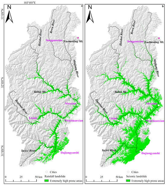 (a) Extremely high prone areas of rainfall landslides in the upper reaches of Minjiang River Basin; (b) Extremely high prone areas of seismic landslides in the upper reaches of Minjiang River Basin.