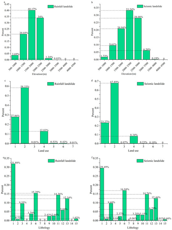 Comparison of distribution of rainfall and seismic landslides that are highly prone to occur in elevation, land use, and lithology ((a) Distribution of highly prone areas of rainfall landslide in elevation; (b) Distribution of highly prone areas of seismic landslide in elevation; (c) Distribution of highly prone areas of rainfall landslide in land use; (d) Distribution of highly prone areas of seismic landslide in land use; (e) Distribution of highly prone areas of rainfall landslide in lithology; (f) Distribution of highly prone areas of seismic landslide in lithology).