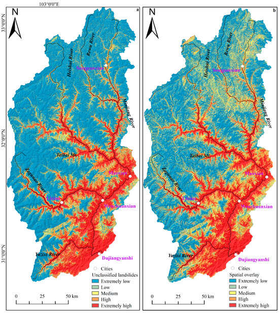 Zoning map of unclassified landslide susceptibility in the upper reaches of Minjiang River Basin ((a) Unclassified landslides susceptibility map; (b) Spatial overlay landslides susceptibility map).