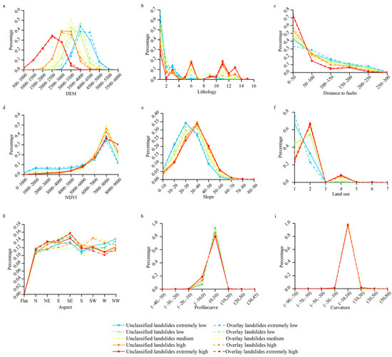 Predicted distribution results of different landslide susceptibility classes on background factors ((a) Distribution on elevation; (b) Distribution on lithology; (c) Distribution on distance to faults; (d) Distribution on NDVI; (e) Distribution on slope; (f) Distribution on land use; (g) Distribution on aspect; (h) Distribution on profile curve; (i) Distribution on curvature).