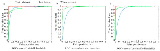 Figure 9a,b, and c show the ROC curves of rainfall, seismic, and unclassified landslides, respectively. Figure 9a shows that the AUC areas of the rainfall landslide training set, testing set, and the whole data set are 0.9997, 0.9485, and 0.9547, respectively. Figure 9b shows that the AUC areas of the seismic landslide training set, testing set, and the whole data set are 0.9996, 0.9809, and 0.9211, respectively. Figure 9c shows that the AUC areas of the unclassified landslide training set, testing set, and the whole data set are 0.9997, 0.9822, and 0.9207, respectively. It can be seen that the WOE-RF model has a high evaluation accuracy for all three landslide datasets.