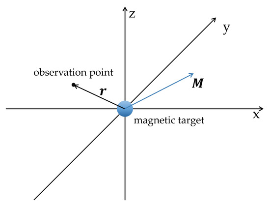 When the detection distance significantly surpasses the size of the magnetic target, it is feasible to simplify the magnetic target into a magnetic dipole model. The spatial Cartesian coordinate system is established to define the magnetic field and MGT, taking the magnetic target as the origin. A schematic diagram is depicted in Figure 1. In this system, according to the Biot–Savart Law, the magnetic field at the observation point is given by: